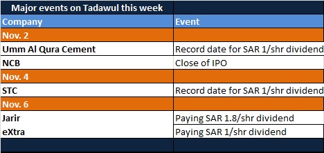 Major events on Tadawul this week 01 November 2014 03:00 PM STC 7010 -0.19% 42.52 -0.08 JARIR 4190 -0.99% 15.05 -0.15 UACC 3005 -0.42% 11.95 -0.05 Investors in Saudi Stock Exchange (Tadawul) are anticipating the following major events this week: Corporate Actions Company News Source: Mubasher Exclusive