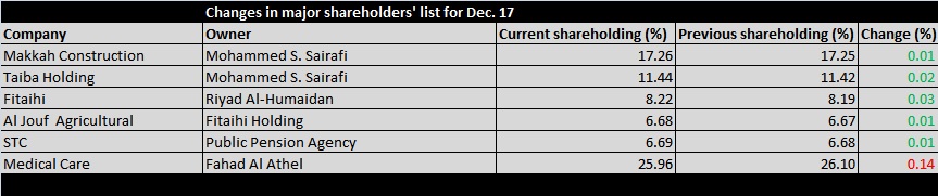 The major shareholders’ list of some companies listed on Tadawul has witnessed some changes on Dec. 17, as follows: