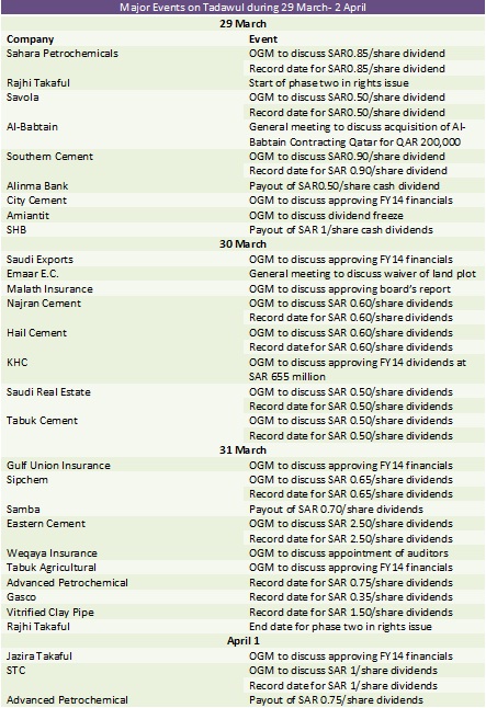 Below is a table for the major events to be seen by Tadawul-listed companies during the week 29 March till 2 April: