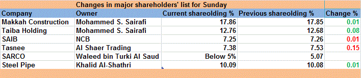 Riyadh-Mubasher: The major shareholders’ list of some companies listed on Tadawul witnessed some changes on Sunday, as follows: