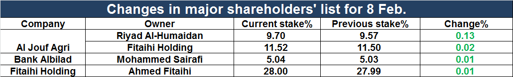 Riyadh-Mubasher: The major shareholders’ list of some companies listed on Tadawul witnessed some changes on Tuesday, as follows: