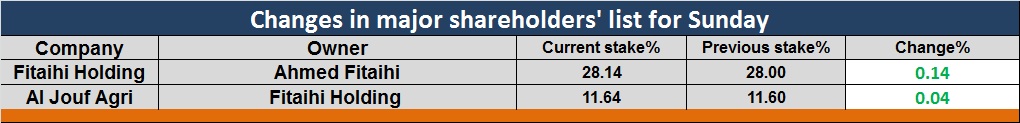 Riyadh-Mubasher: The major shareholders’ list of some companies listed on Tadawul witnessed some changes on Sunday, as follows: