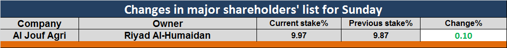 Riyadh-Mubasher: The major shareholders’ list of Al Jouf Agricultural Development witnessed some changes on Sunday, as follows: