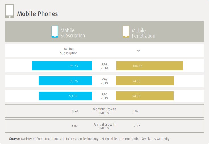 Year-on-year, the number of mobile subscribers in the most populous Arab nation dropped by 1.82%, or 1.74 million, from June 2018.